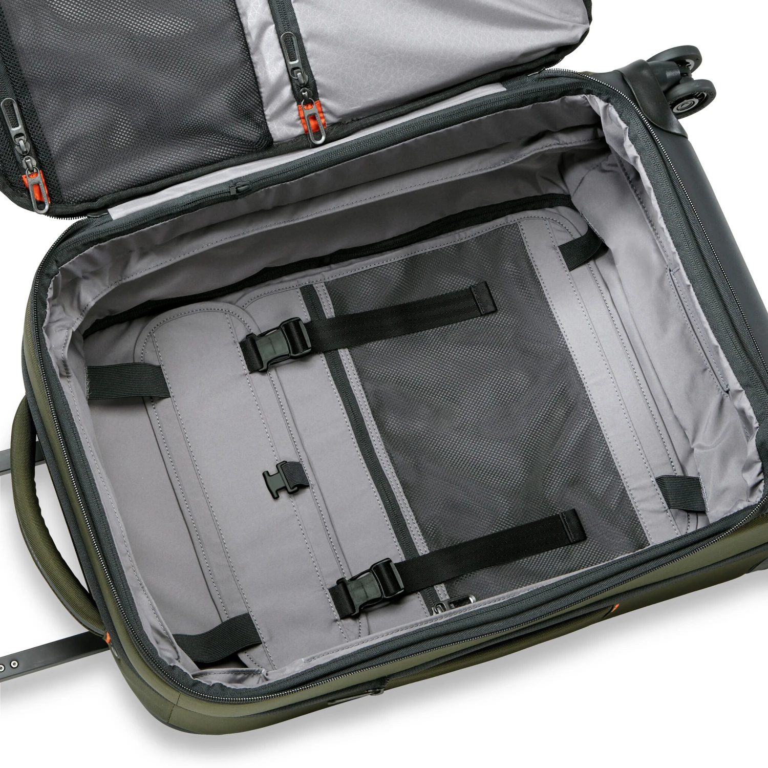 - Large cinch down garment panels keep contents from shifting in transit; an integrated mesh zip pocket keeps smaller items within easy reach