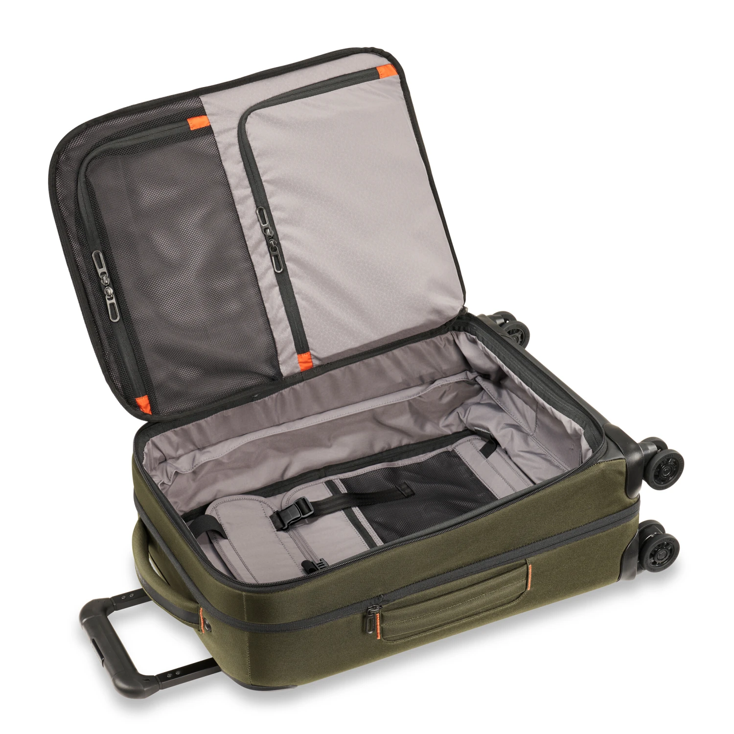 - Patented Outsider® handle for wrinkle-free flat packing and greater interior packing capacity