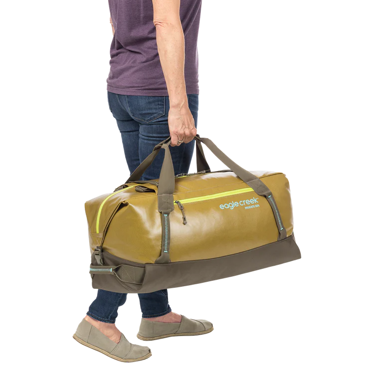 Whether you`re hauling camping gear or expedition packing, the eco-friendly Migrate Duffel 60L will make it through all your adventures with its heavy-duty construction. Carry it on your back, check it at the airport, or tie it down on your vehicle. This water-resistant TPU coated duffle will take a beating and then some.