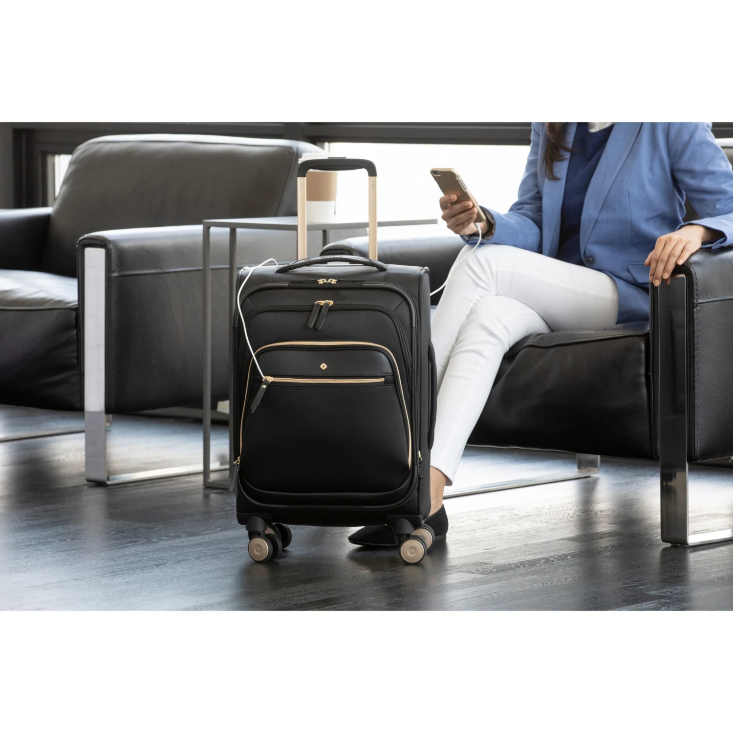 Skip checking a bag, carry on with style and ease. Expansion, a USB charging port and a patent pending Wireless Charging pocket create the ideal marriage of smart tech and sleek form in our Expandable 19” Spinner.
