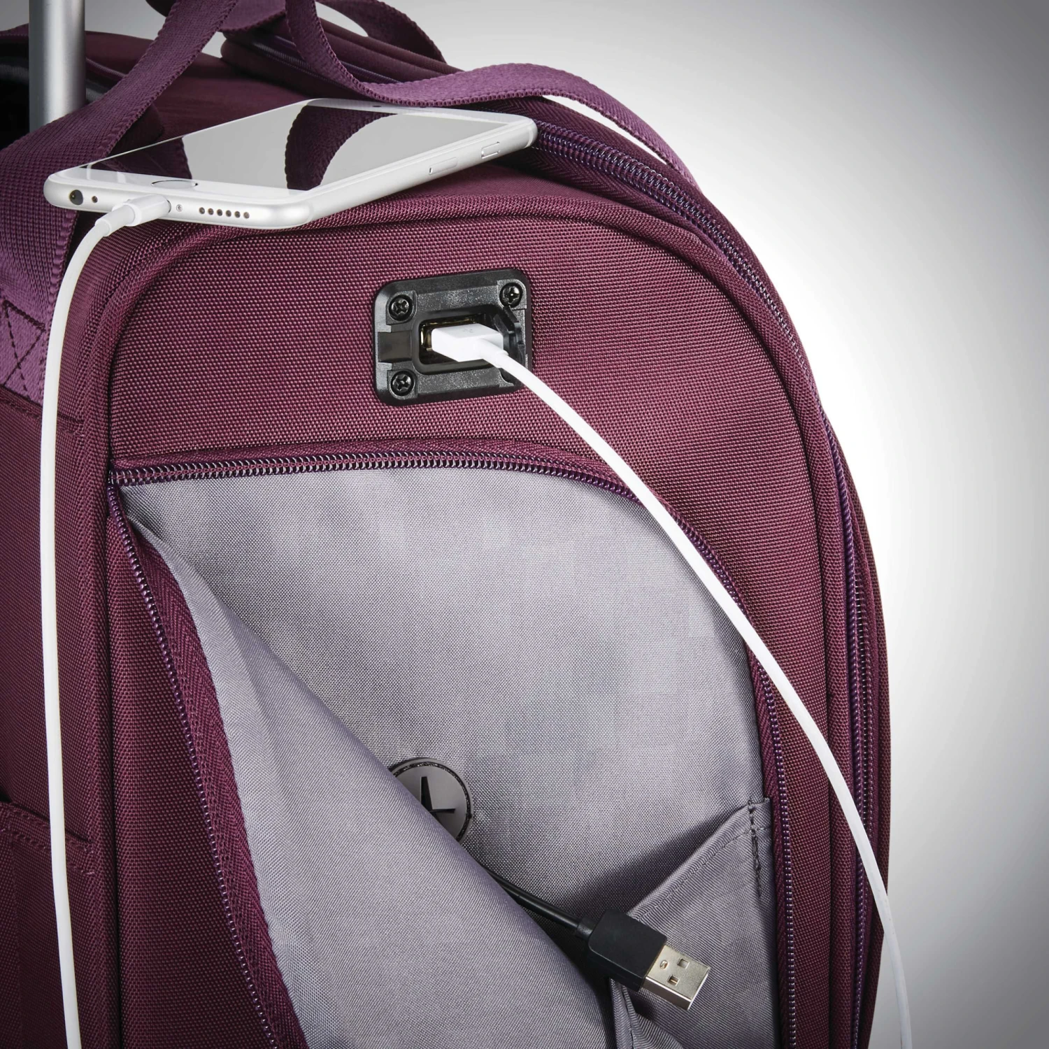 - Smart sleeve on back allows bag to be placed over handle of most upright luggage pieces