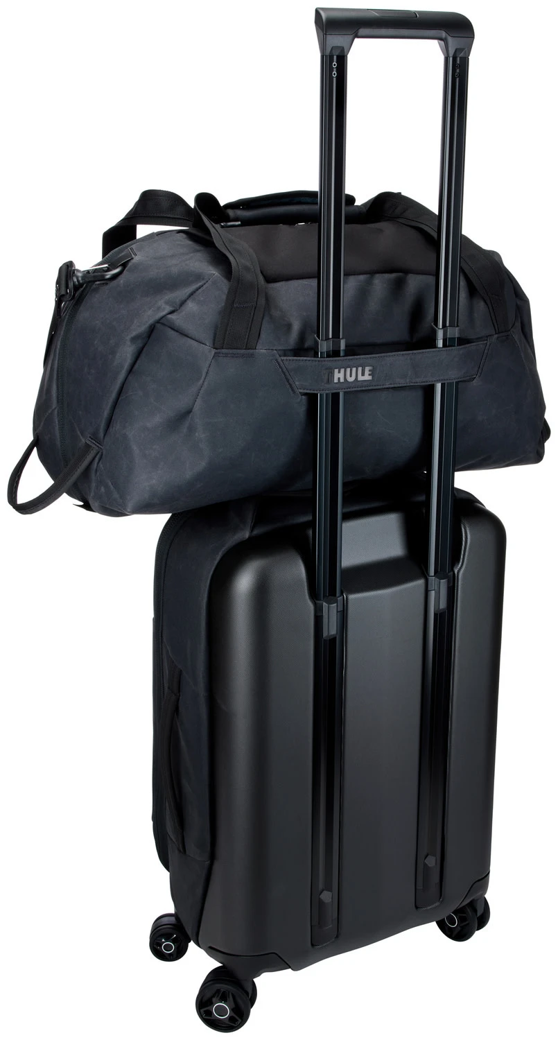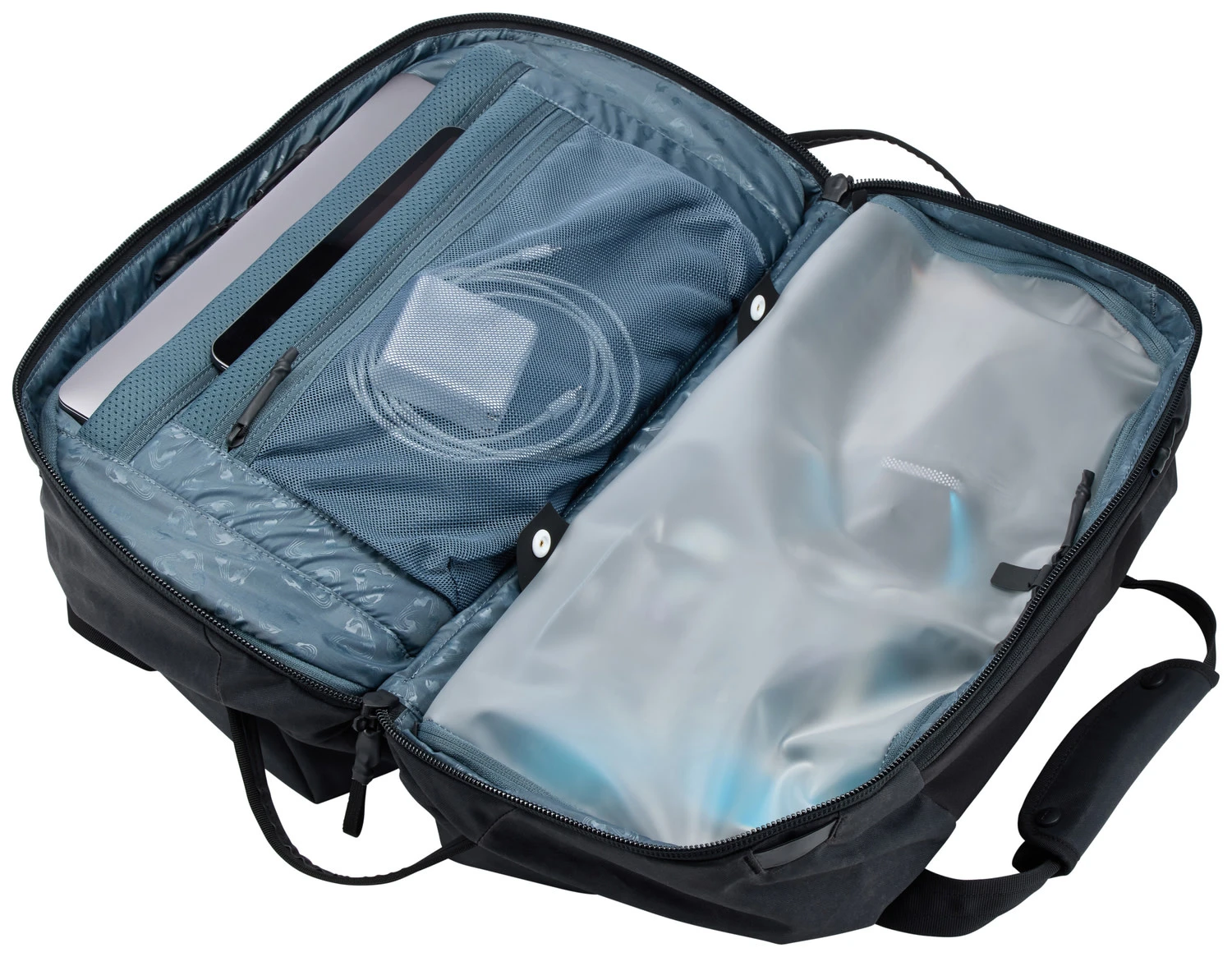Thule Aion 35L duffel bag has an internal divider that separates the duffel into two compartments, making it easy to keep everyday items separate from outdoor gear. The TPU-lined compartment locks in all odor, dirt, and moisture – perfect for storing dirty clothes or damp sportswear. The duffel also has storage space for a 15.6″ PC/16″ MacBook and 12.9″ tablet and attaches to rolling luggage thanks to the pass-through panel.